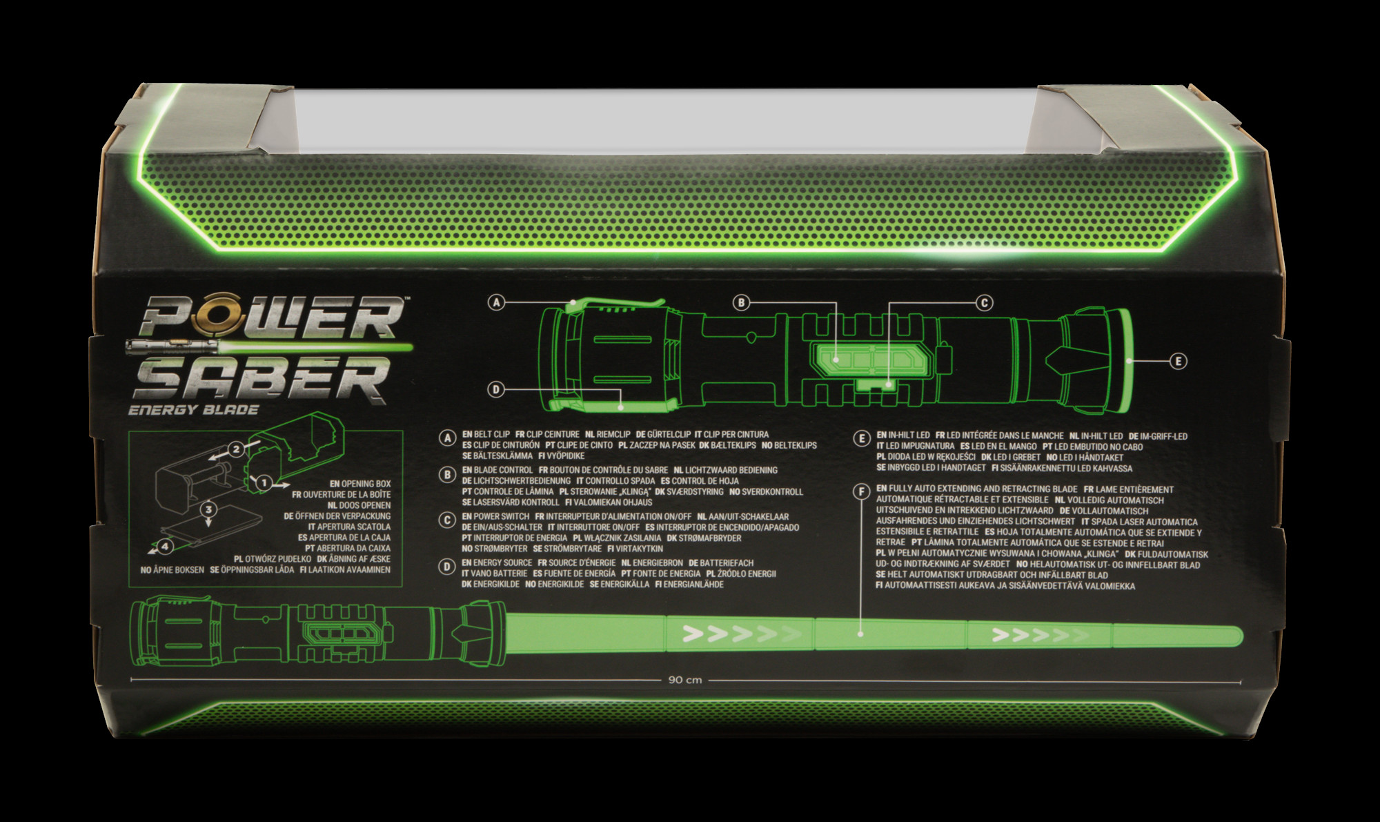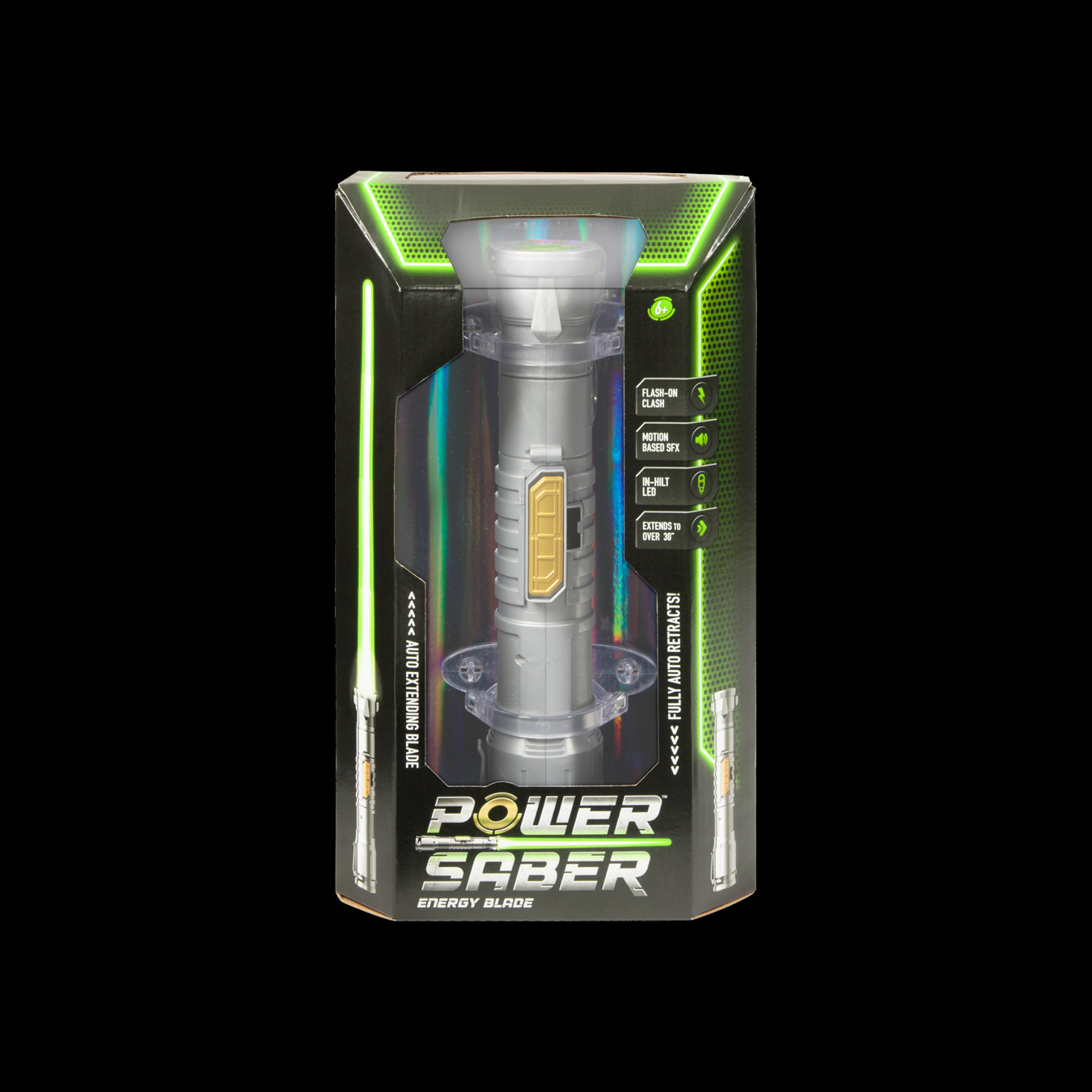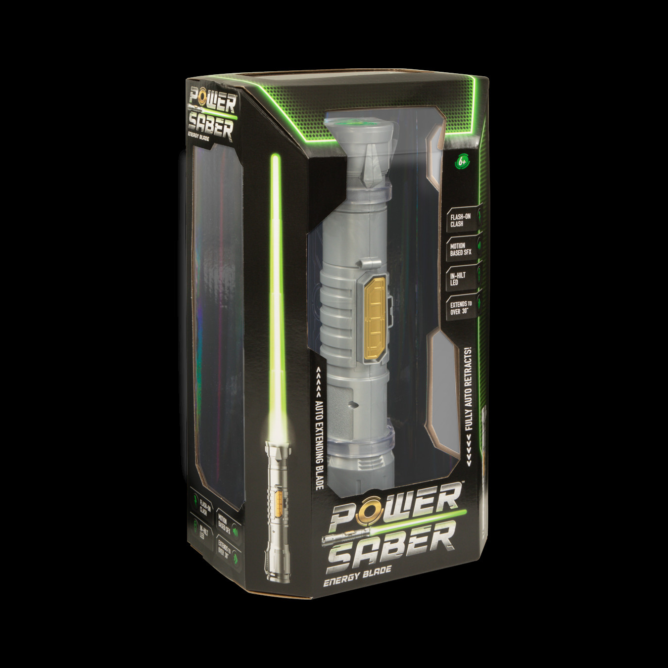 Power Saber is the world’s first fully auto extending & retracting saber. With motion based SFX, flash on clash & in an in-hilt LED, this saber delivers the most realistic experience. Extend the saber to 90 cm and get ready for battle, accompanied with motion-based sound effects and realistic flashes! After battle, the Power Saber can be displayed on the included stand or carried around with the belt clip. Available in red & green, choose your side! This saber is suitable for kids ages 6 and up and recommended for any fan.