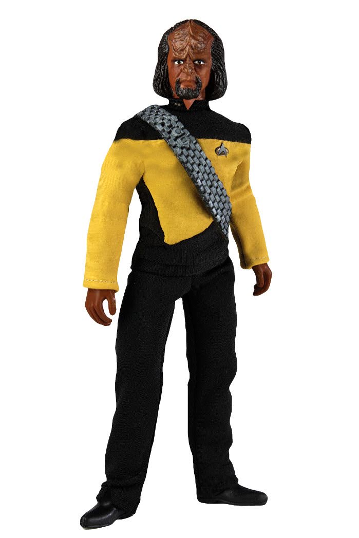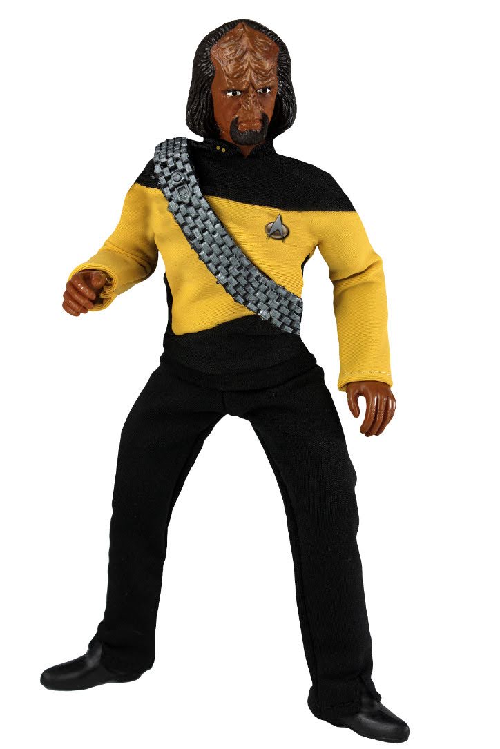 This highly articulated action figure of Lt. Worf in his uniform from "Star Trek: The Next Generation" stands approx. 20 cm tall and comes with fabric clothing and accessories in a blister packaging.