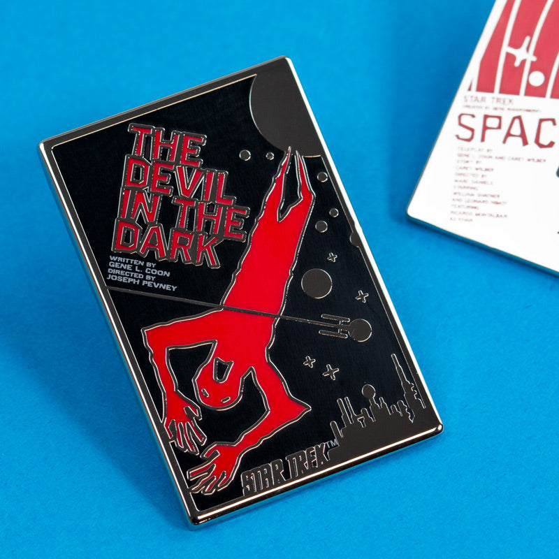 Contents: Two premium quality hard enamel metal pins with a glossy finish featuring 'The Devil in the Dark' and 'Space Seed' designs on a backing card