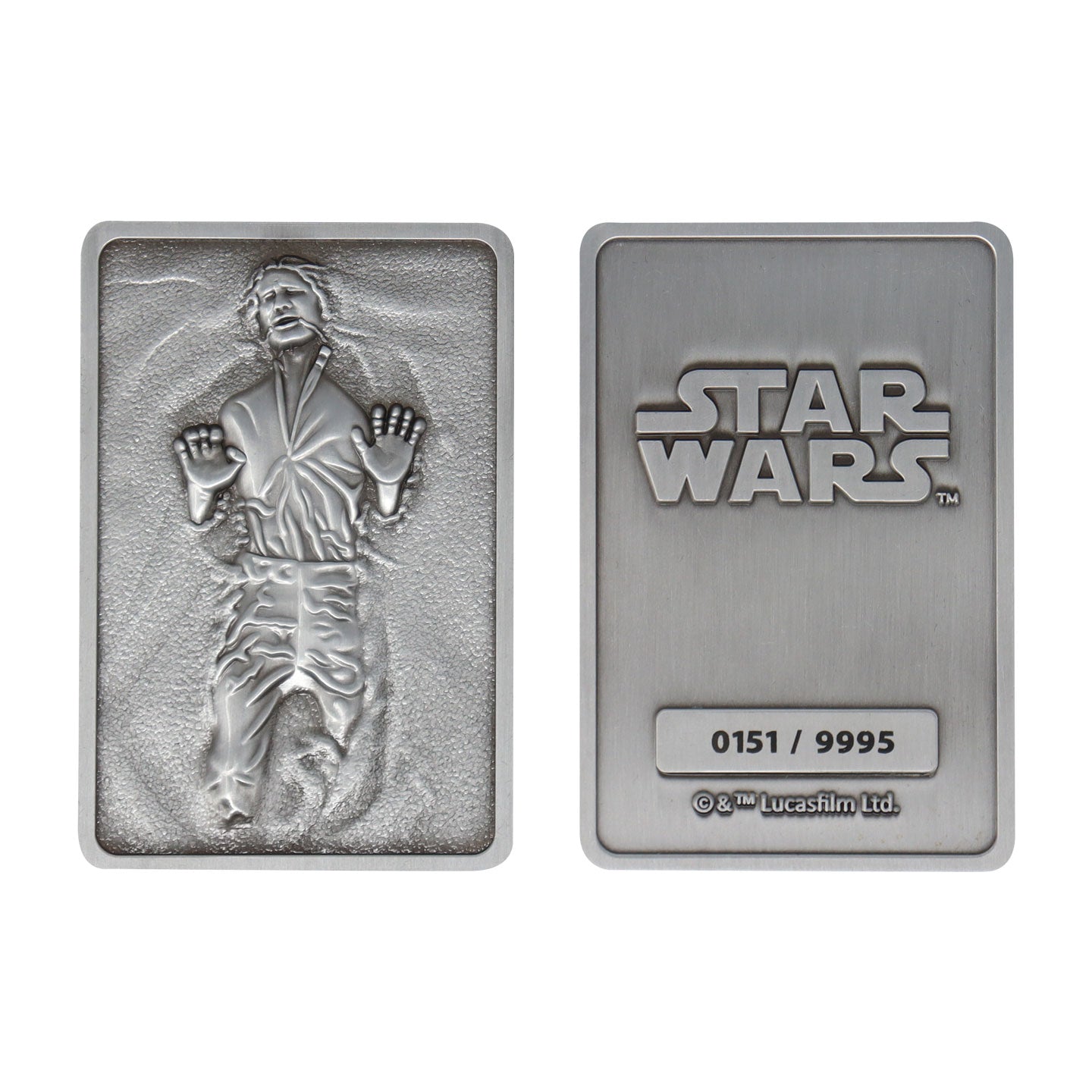 Frozen in Carbonite, Han Solo pays the price for his allegiance with Luke Skywalker. An attempt to lure Luke into a trap, Han becomes a test to see if Luke could be incarcerated with this same method. Embossed here onto a metal ingot, this scene is fantastically captured.