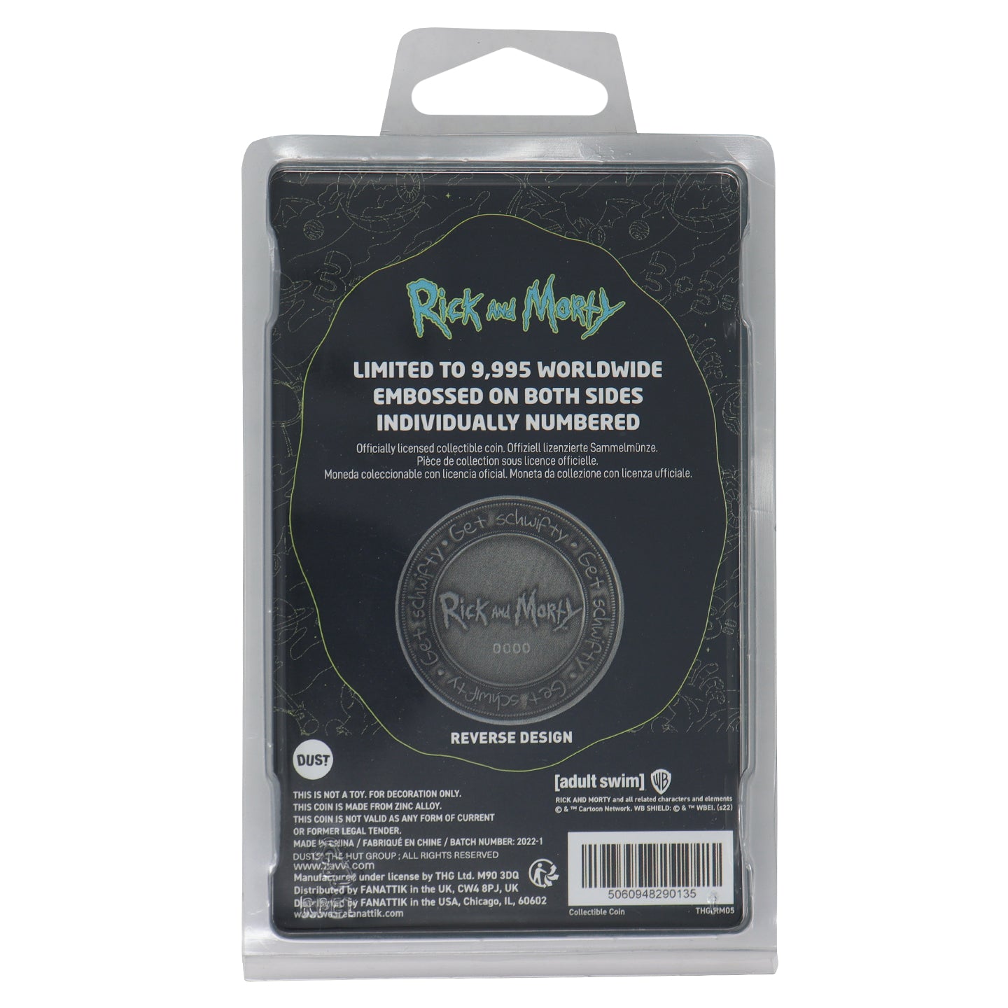 Rick & Morty can be seen on our embossed double-sided coin. Limited to only 9,995 worldwide and individually numbered, this coin is 38mm in diameter and supplied within a protective acrylic cup and then in a display pack. The re-sealable packaging is made in the UK from recycled material and is also fully recyclable.