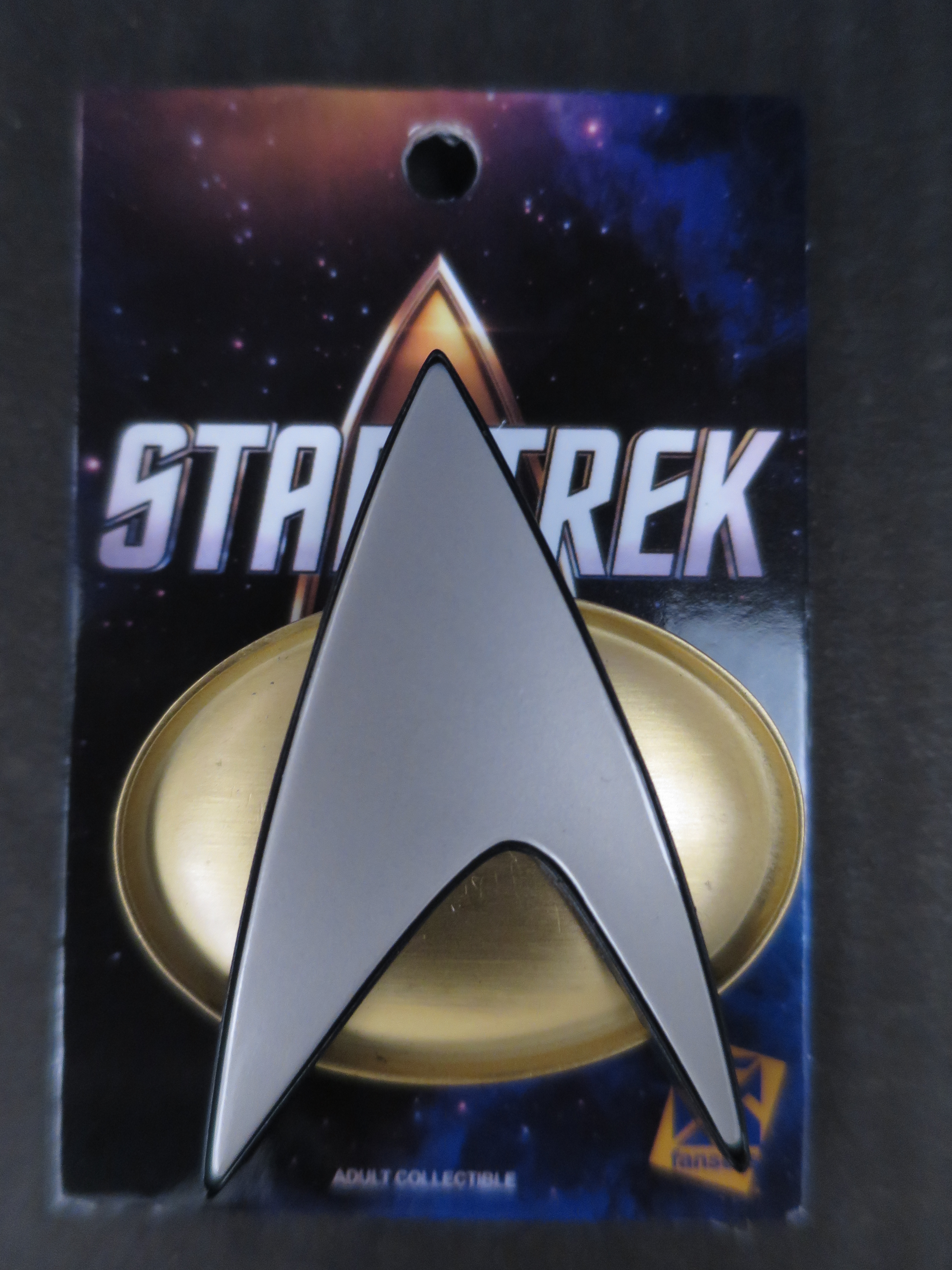 This delta comes to you directly from Star Trek: The Next Generation. It is full size. While manufactured with FanSets normal attention to detail this was not created to be a cosplay piece but can be worn by any fan even in daily life. The delta features a matte brushed metal finish. The magnetic and pin versions have two horizontal magnets or clutches to hold it securely in place. This delta is not a prop replica.