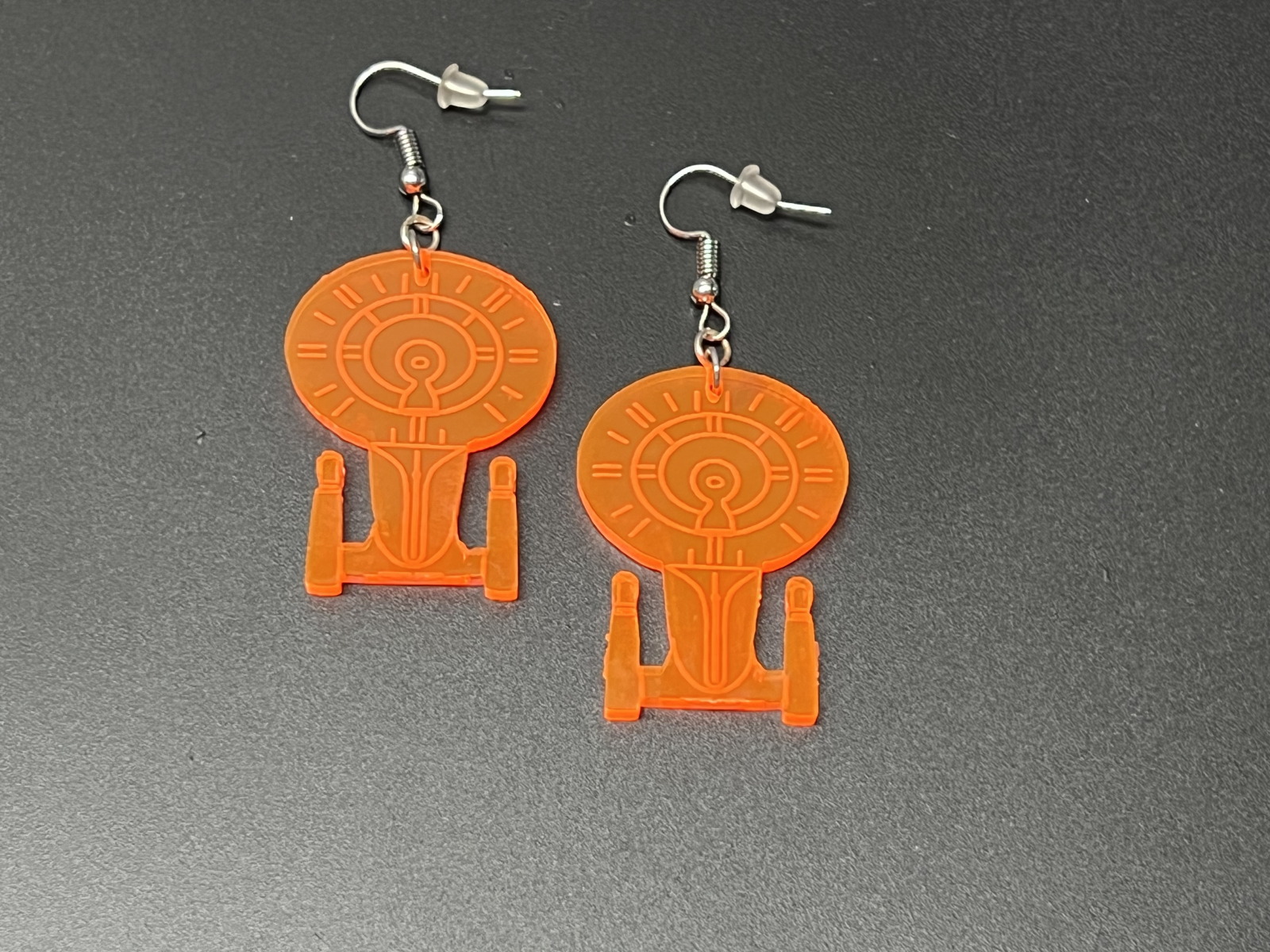 This article is a pair of dangling earrings with a laser-engraved art replica of a Galaxy class starship. Each one is individually produced and can therefore differ slightly from others, e.g. samples shown in pictures.