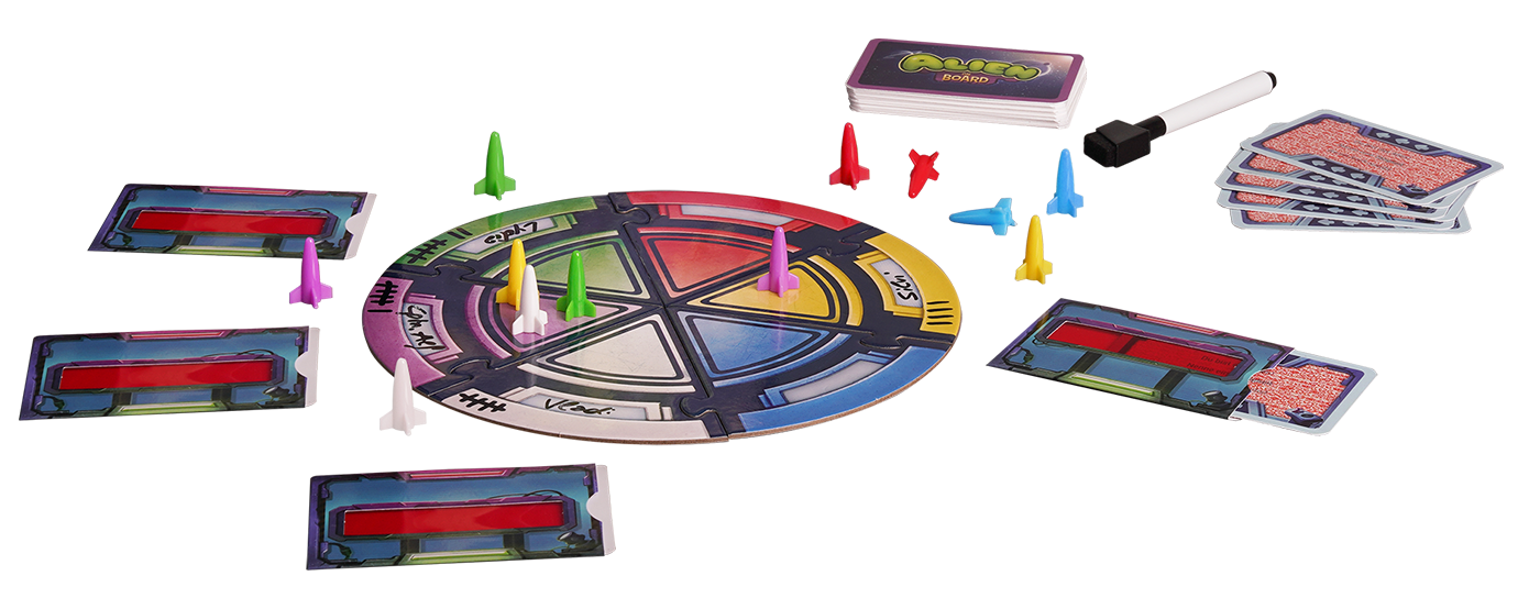 Three to six space fans of ten years and above form the crew, among whom an alien has mixed in undetected. Can the being mislead the crew members or will it be exposed by them? The roles of spaceship crew and aliens are assigned newly in every round and of course remain secret. This is decided by the decoders, which are randomly distributed by the commander, into which a playing card is then pushed with a question. Now it becomes apparent how smart the alien is, because its question only refers to an overarching topic (for example, “Name one thing”), while the crew members read the full question (for example, "Name one thing thing that can be found in a castle") and can thus reply more easily.